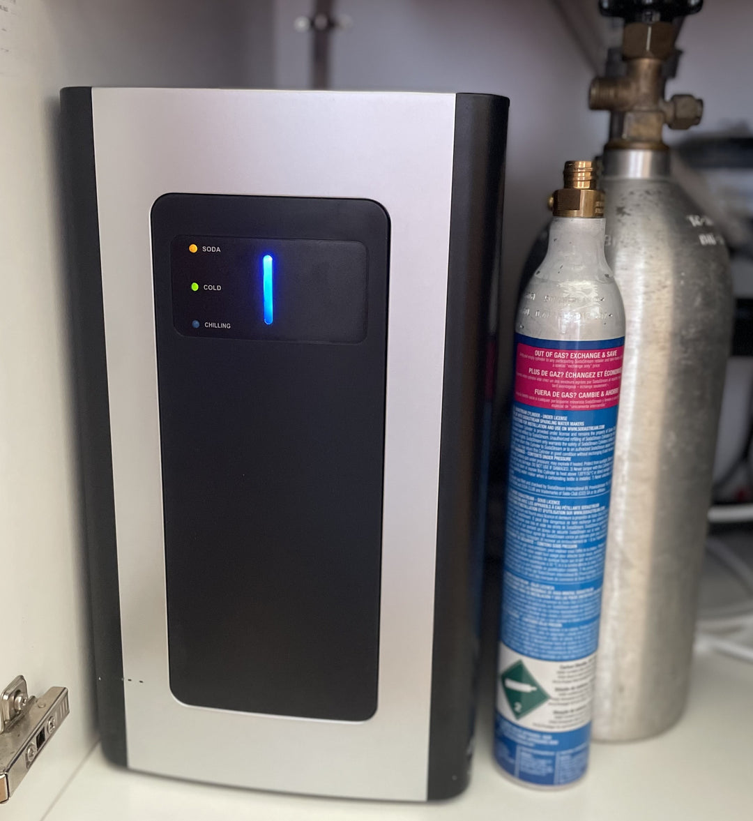 The SeltzaHub unit lives below your sink, carbonating and chilling sparkling water, ready to be dispensed on demand.